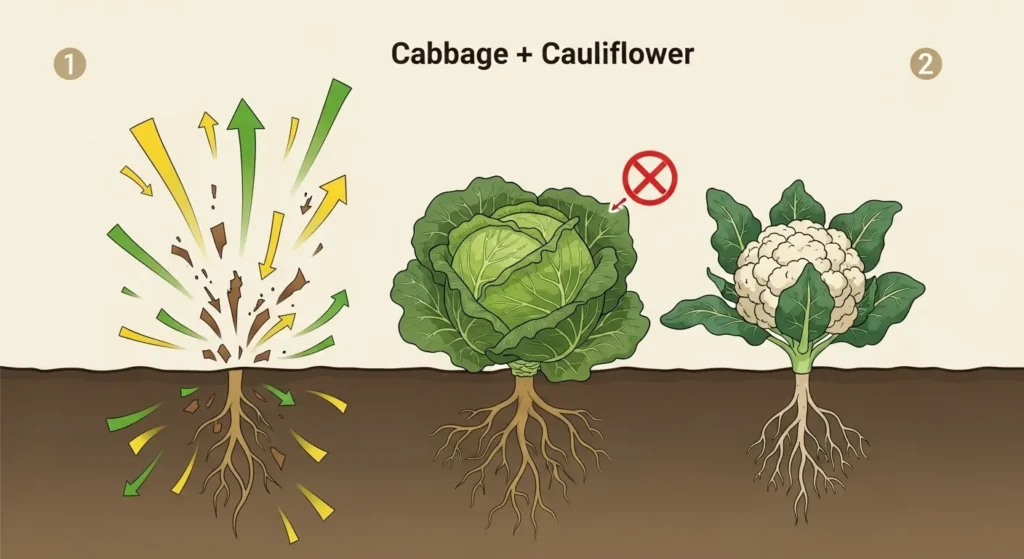- Cabbage + Cauliflower → Brassicas planted together quickly exhaust the soil.