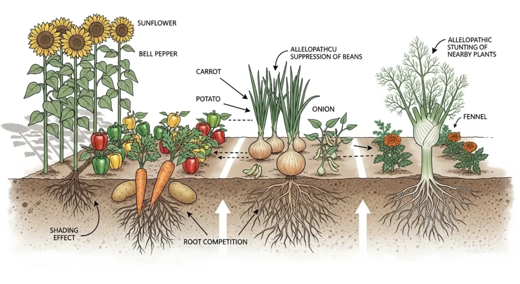 u003cstrongu003eHeavy feeders together:u003c/strongu003e Corn + tomatoes or cabbage + cauliflower exhaust soil.u003cbru003eu003cstrongu003eAllelopathic neighbors:u003c/strongu003e Fennel inhibits many plants.u003cbru003eu003cstrongu003eShade conflicts:u003c/strongu003e Sunflowers can stunt peppers.u003cbru003eu003cstrongu003ePest pairing:u003c/strongu003e Dill near carrots attracts carrot rust fly. Plan spacing, sun, and crop rotation to prevent these issues.