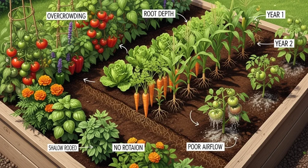 - Ignoring root depth → Mixing deep-rooted crops (like carrots) with shallow-rooted ones (like lettuce) works well, but planting two deep-rooted crops together leads to stunted growth.
