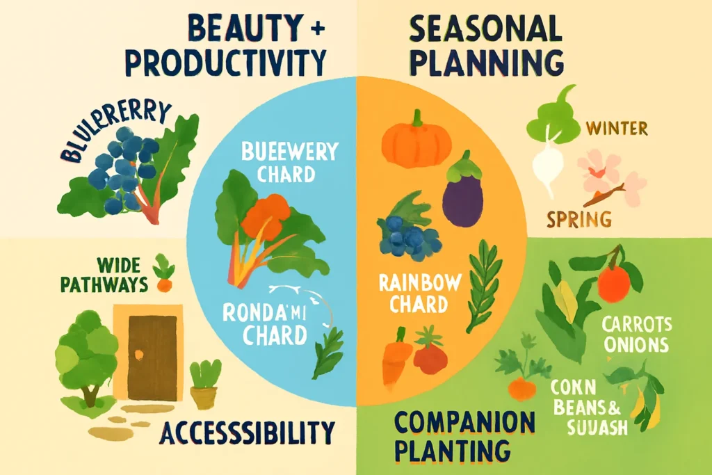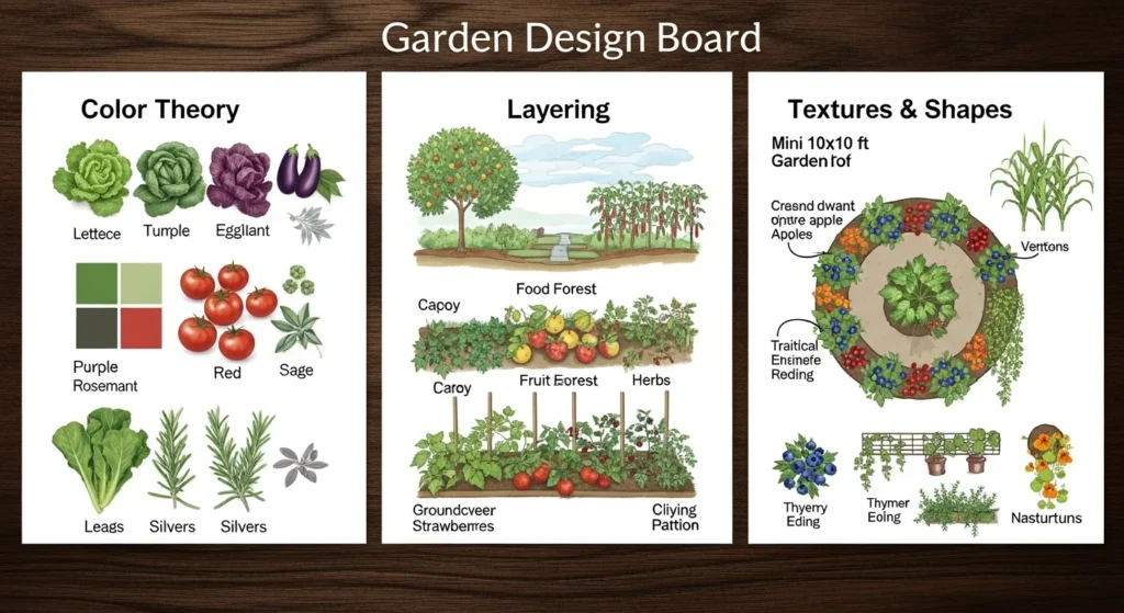 đź’ˇ Mini design exercise: Imagine a 10×10 ft garden. Place a dwarf apple tree in the center, surround it with blueberry shrubs, edge the bed with thyme, and let nasturtiums trail over the sides. You’ve just created a layered, edible landscape that looks like a designer’s dream.